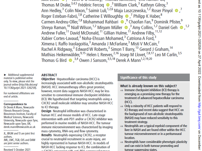 Landmark paper that describes a new treatment for liver cancer that develops on the background of fatty liver disease and highlights the potential for neutrophils which are specialised immune cells to contribute to cancer immunotherapy. The work was the basis for obtaining for a multi-centre UK clinical trial (CUBIC) in advanced liver cancer that is now underway.