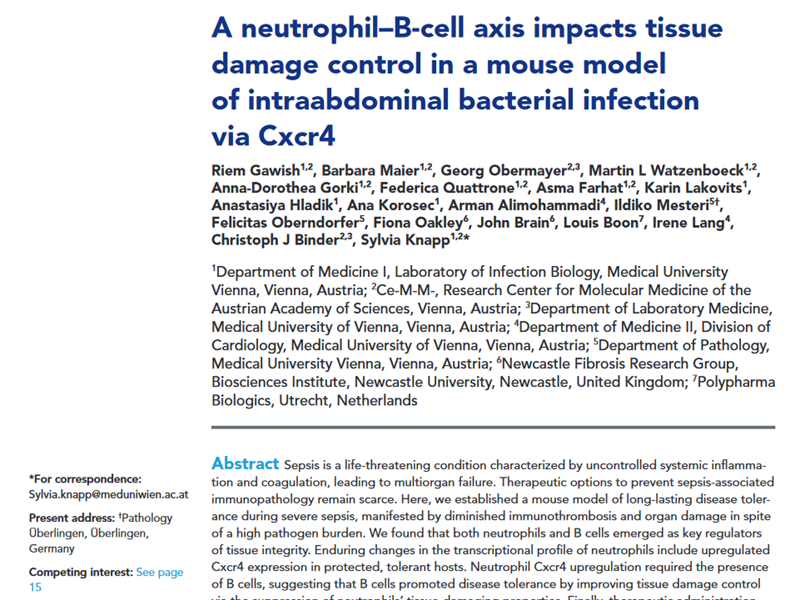 A neutrophil–B-cell axis impacts tissue damage control in a mouse model of intraabdominal bacterial infection via Cxcr4