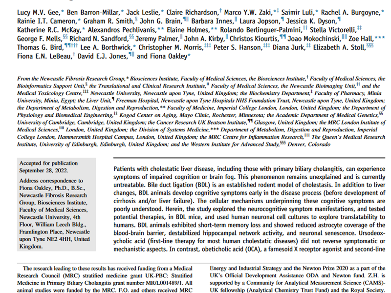 This paper showed that obeticholic acid (OCA), a farnesoid X receptor agonist and second-line anti-cholestatic agent for treating PBC improved cognitive function, hippocampal connectivity and reduced neuronal senescence in a mouse model of cholestatic liver disease where cognitive impairment is a feature of the model. To extend the observations to a human system, cultured human neurons (stem cell derived) with cholestatic serum induced senescence, and, this was reversed by OCA.