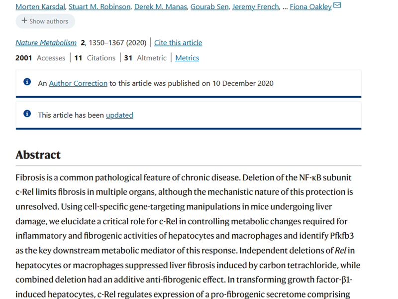 Here FibroFind scientists collaborated in a study led by Professor Fiona Oakley (FibroFind founding scientists and Director) that describes how a factor (c-Rel) that is best known for its role in the immune system also controls metabolic processes that are important for fibrosis. The identified c-Rel/Pfkfb3 pathway is proposed as a target for the development of anti-fibrotic drugs.